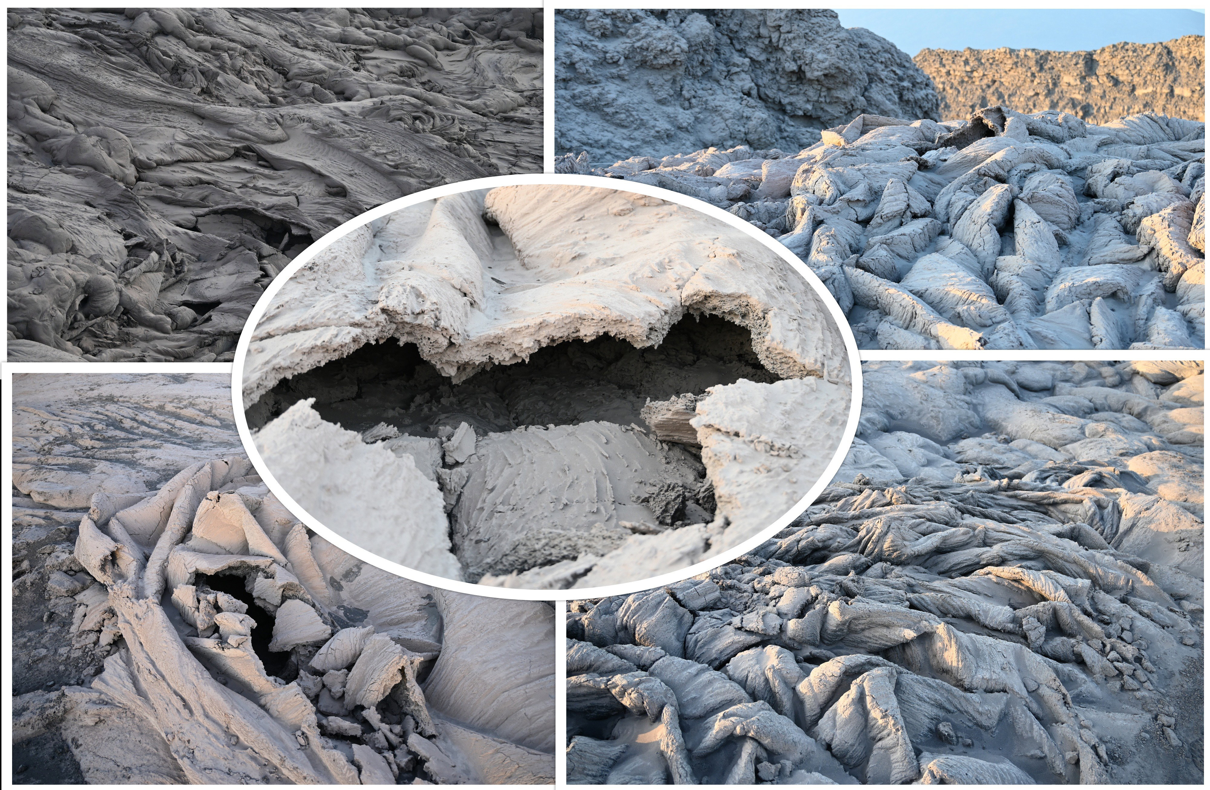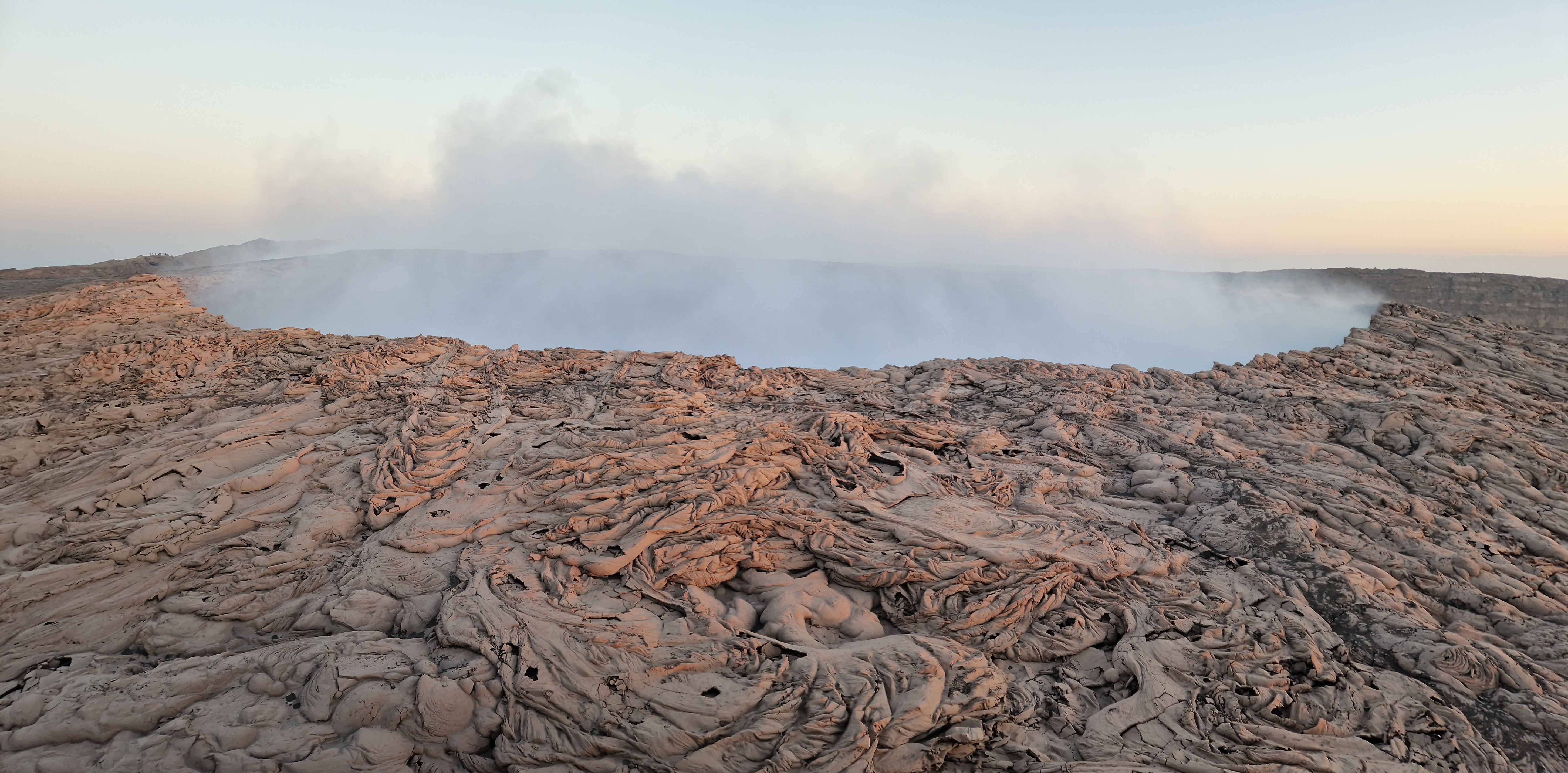 L'immense cratère est constitué par 2 volcans, le premier éteint, et Erta Alé bien actif. C'est une immense mer de lave qui craque sous les pieds, il faut faire très attention en marchant dessus car sous la couche superficielle, le vide peut être très profond. On dirait un tableau abstrait de lignes courbes.