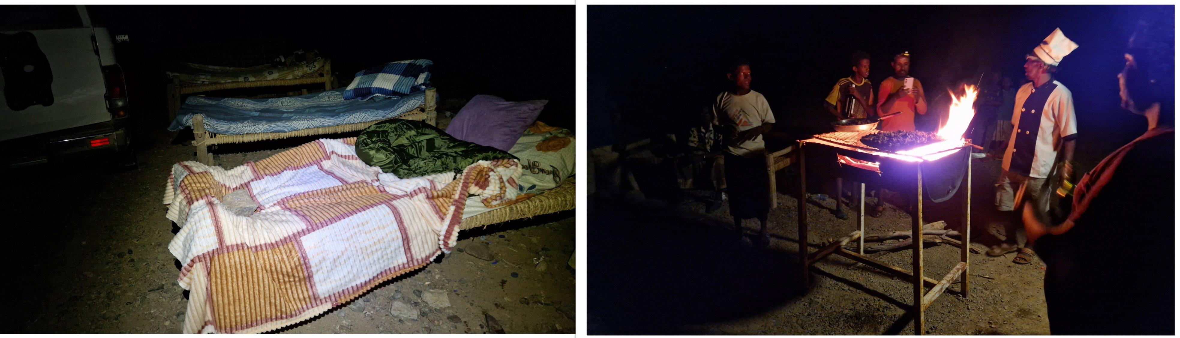 Et nous voici au camping pour cette nuit ! Des "litières" en plein air, pas d'eau, pas de toilettes, et notre cuisinier pour nous faire à manger, le tout au milieu d'un village de tôle.