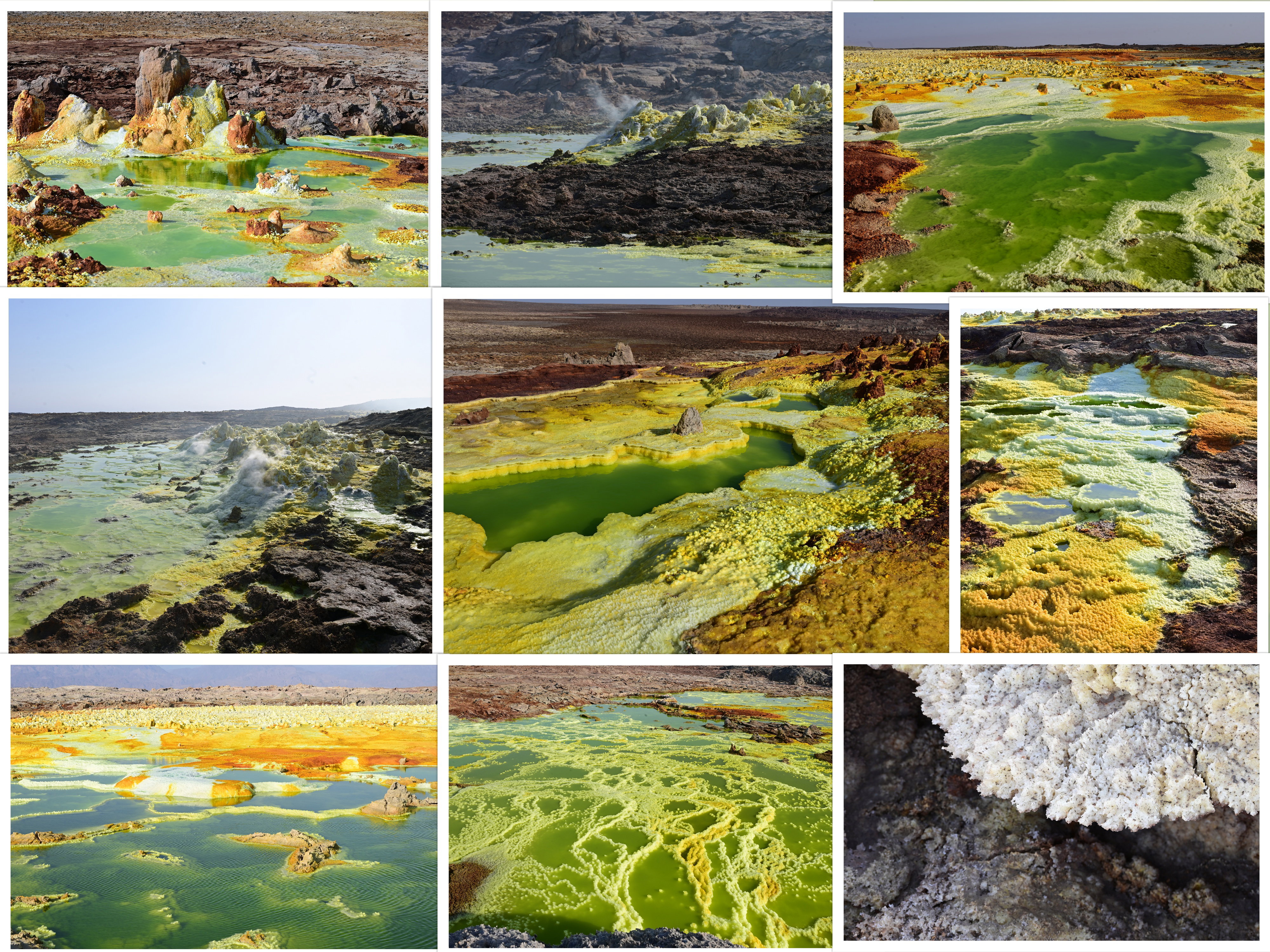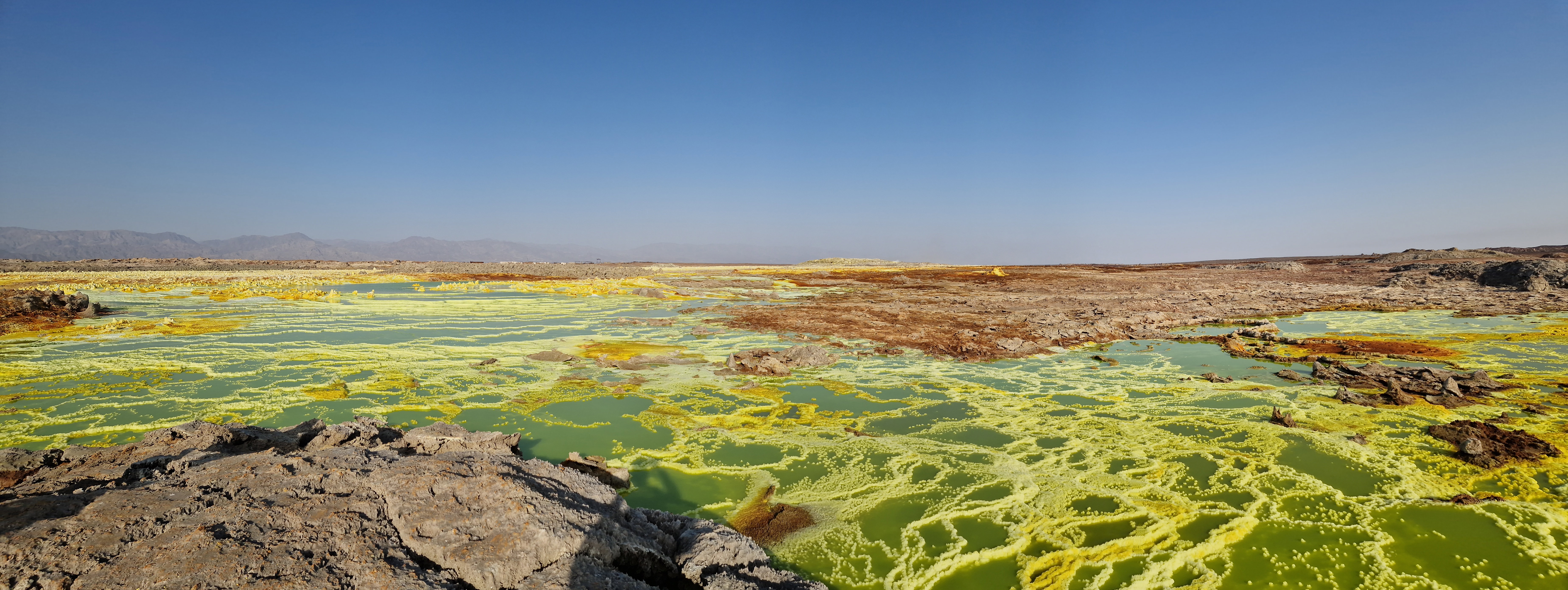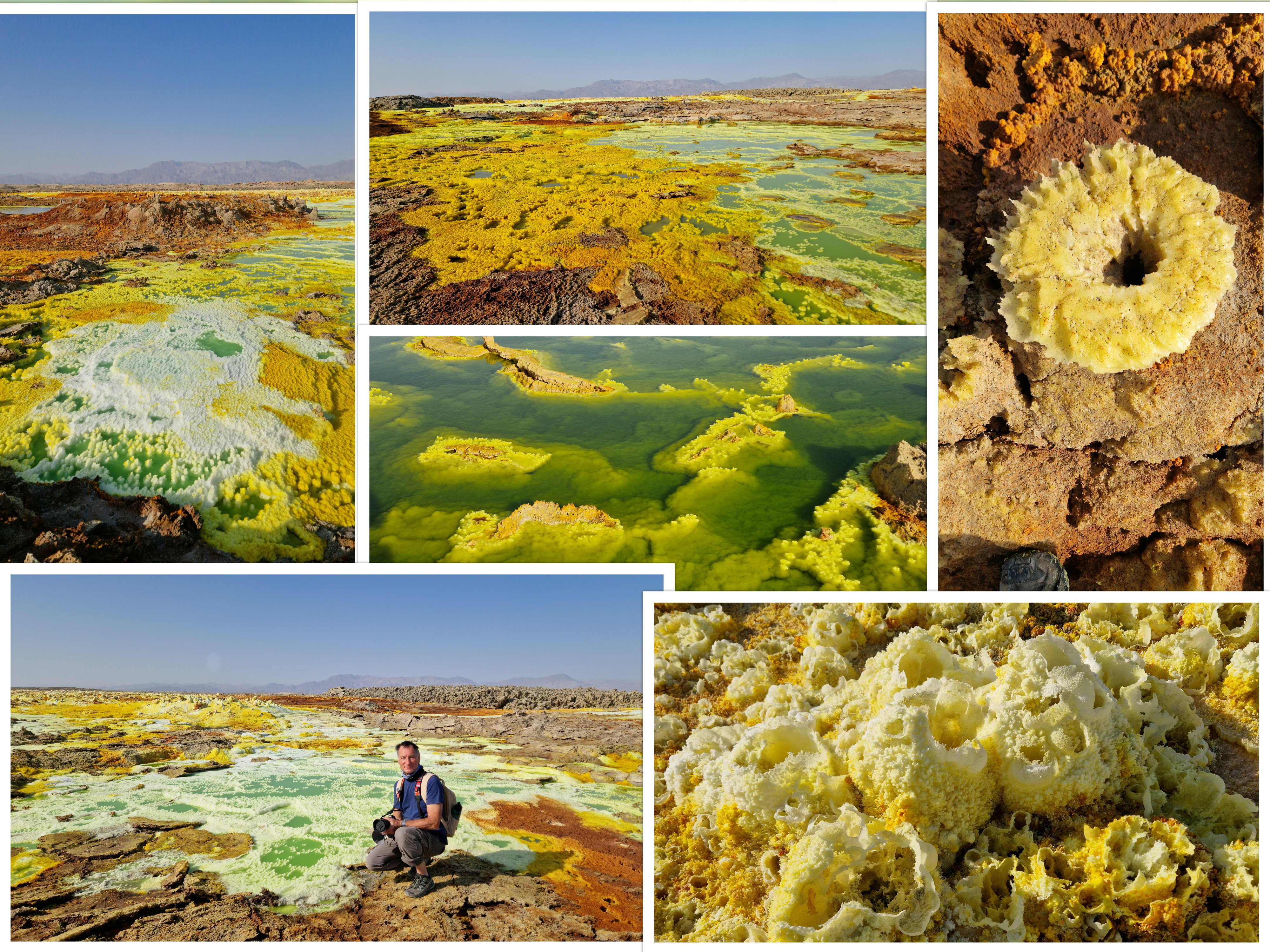 Le Dallol est un des sites géologiques les plus étonnant d'Ethiopie, et je rajouterai au monde. Il se situe dans le Danakil. Il est composé de sources hydrothermales colorées par des dépôts de soufre jaunes, vers et oranges éclatants.
