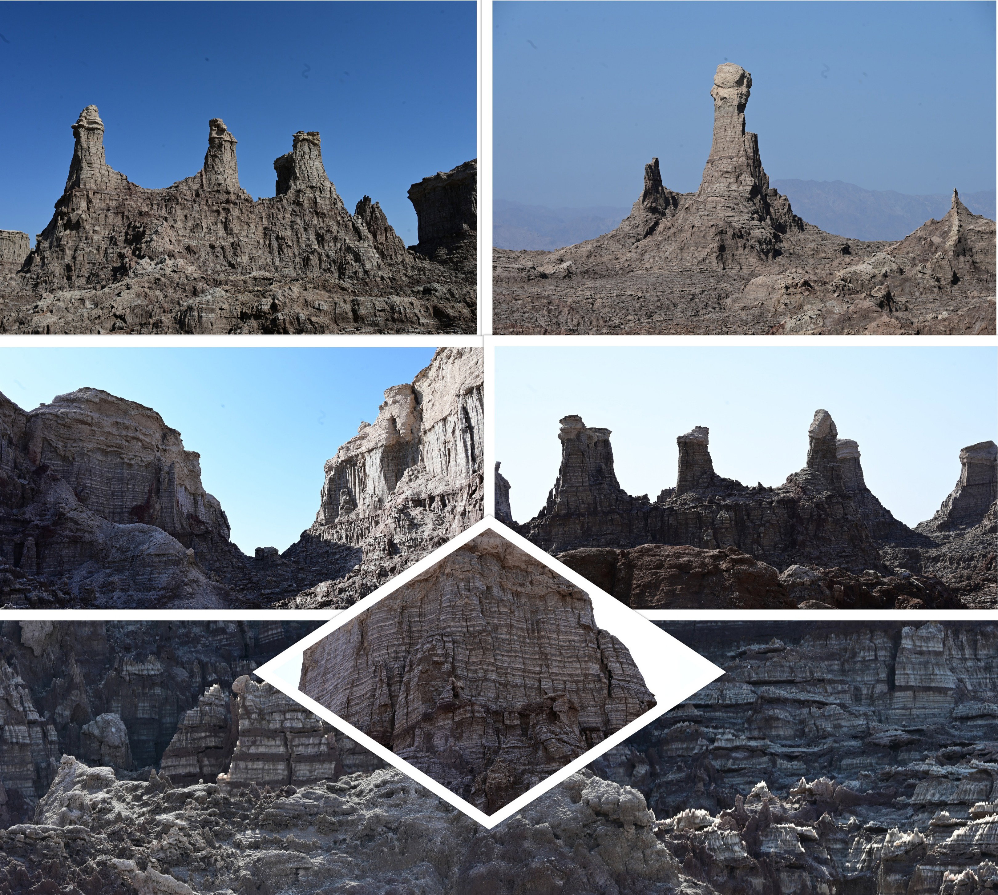 A 100 mètres, du Dallol, un petit canyon avec des rochers qui montent dans le ciel, comme des totems. Il est presque midi, je pense qu'il fait 40°C minimum, mais supportable car l'air est très sec.