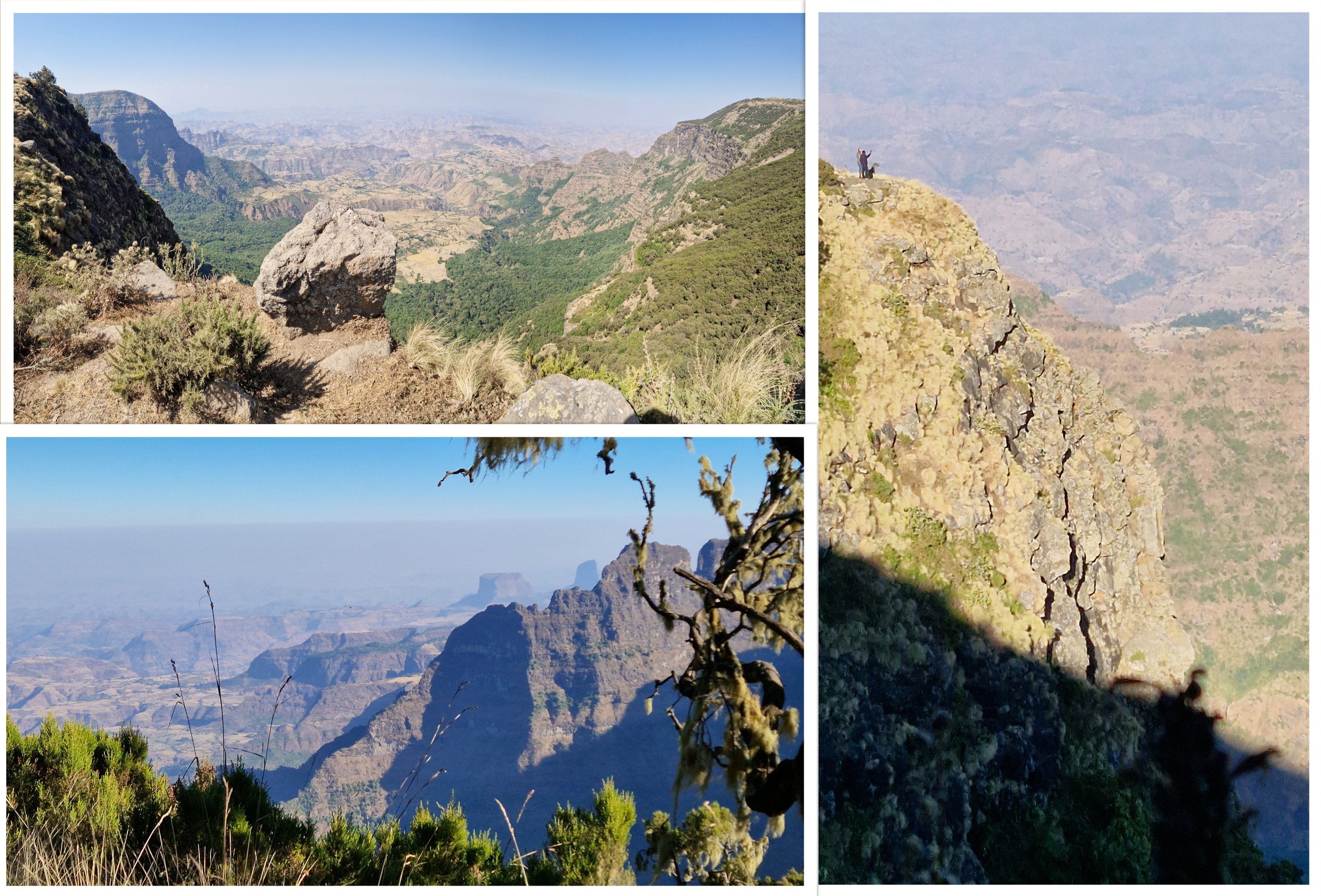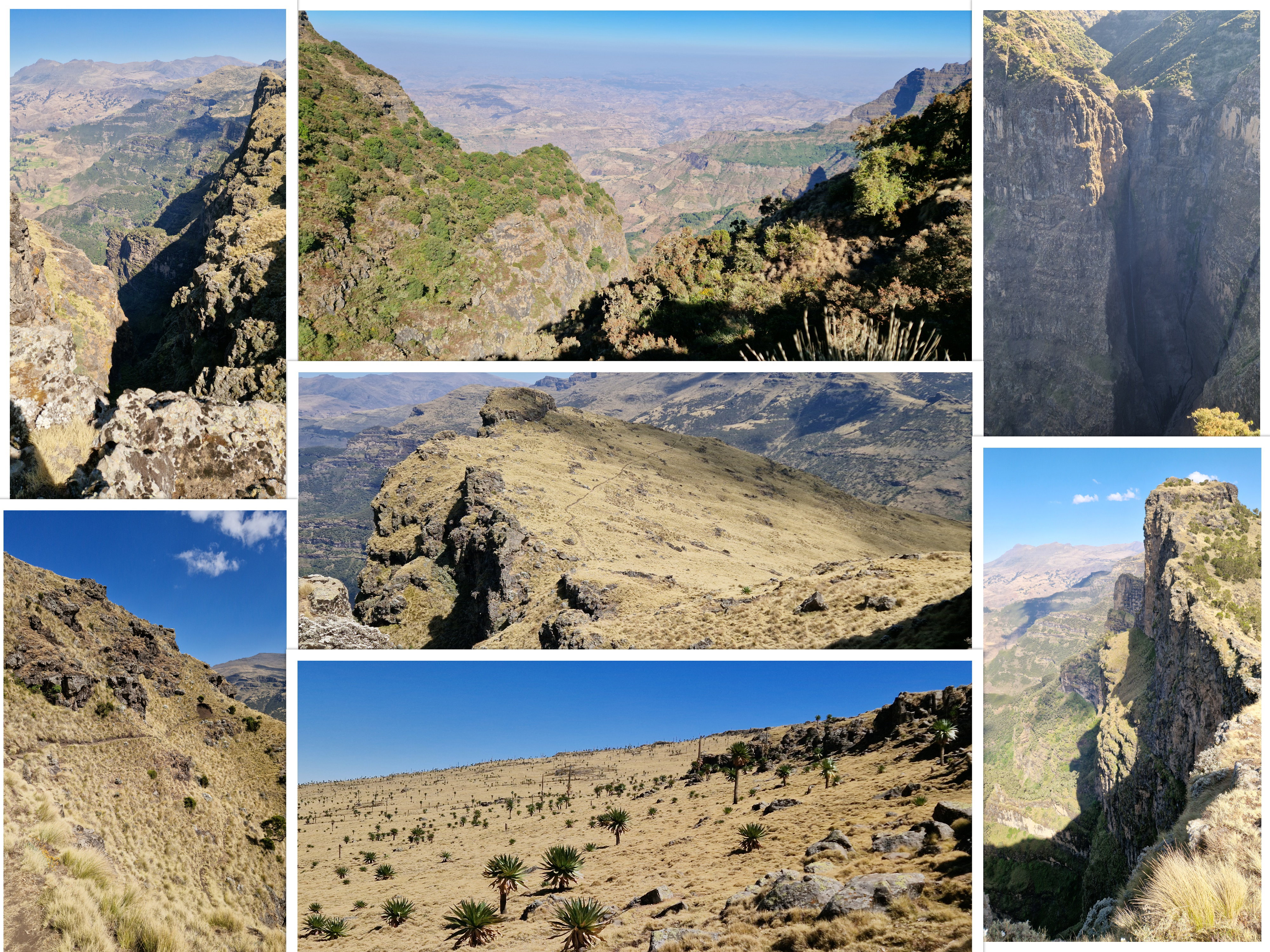Les montagnes Simien se situent dans la région Amhara. C'est un paysage spectaculaire avec ses falaises abruptes et ses canyons, classé à l'Unesco depuis 1978. On y trouve le sommet le plus haut d'Ethiopie, le Ras Dashen, qui culmine à 4500 mètres.