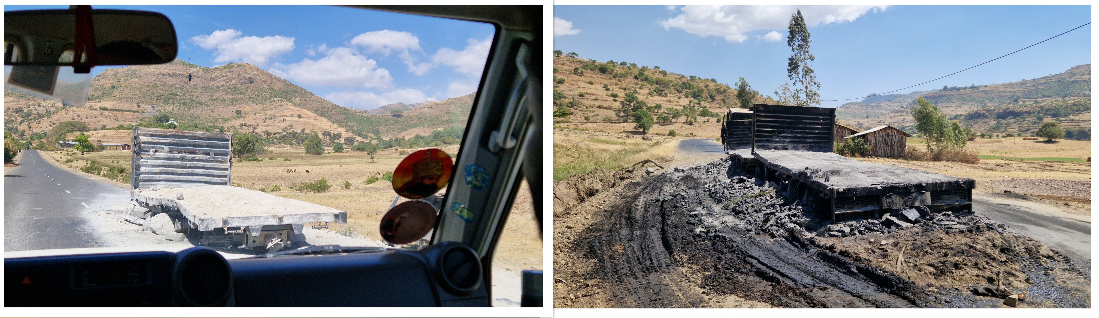 Rébellion bien réelle, en témoignent ces camions brûlés sur la route.