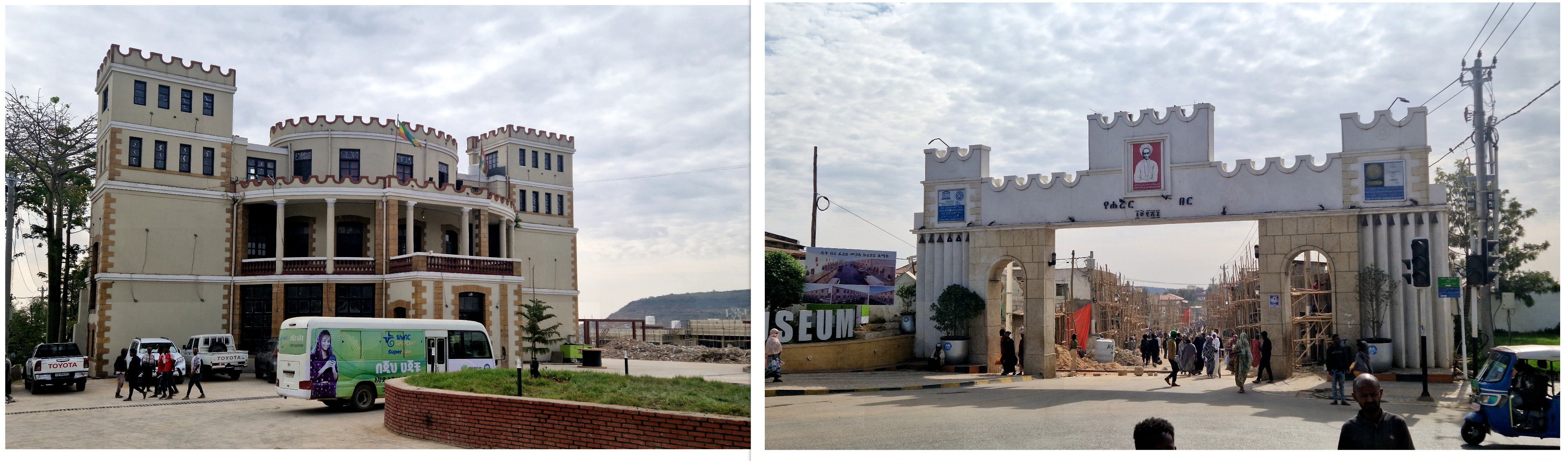 Le Palais d'Haylé Sélassié (aujourd'hui bâtiment administratif, et la porte d'Haylé Sélassié, bien plus moderne). A l'arrière, la rue "principale"en rénovation, ils construisent des boutiques de chaque côté.