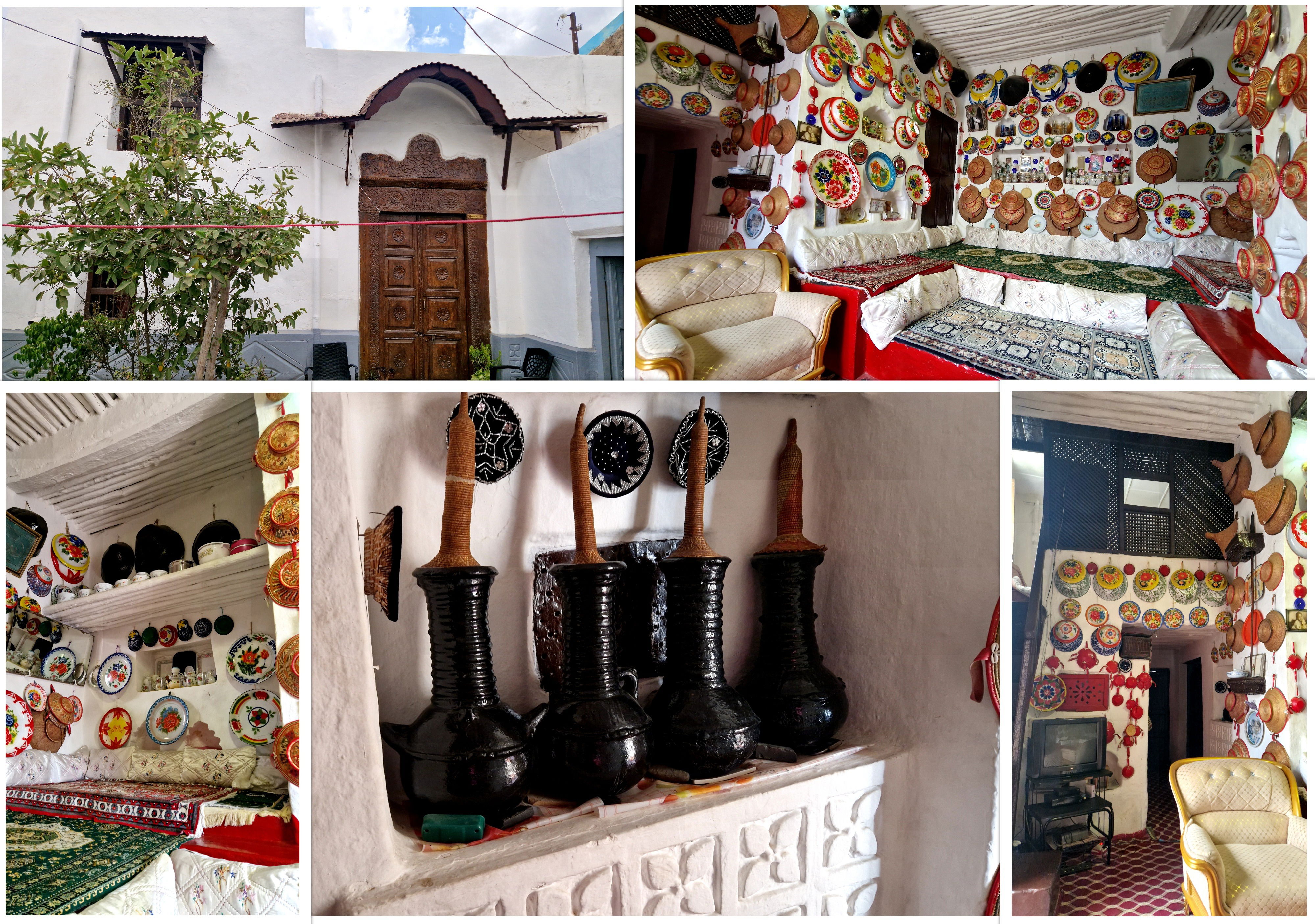 Elles sont toutes constituées de la même manière : une grande pièce de vie avec 5 niveau de sofas (correspondant aux 5 préceptes du Coran : un niveau pour le mari, un pour les femmes, un pour les enfants, un invités, et un - le plus haut - pour celui qui récite la prière), deux ou 3 chambres dont une au 1er étage (avec des escaliers aux marches très hautes, il s'agit de ralentir l'envahisseur qui monte chercher les parents, et donner le temps à ces derniers de se préparer). Certaines se sont modernisées en ayant une "selle d'eau". La cuisine est à l'extérieur.