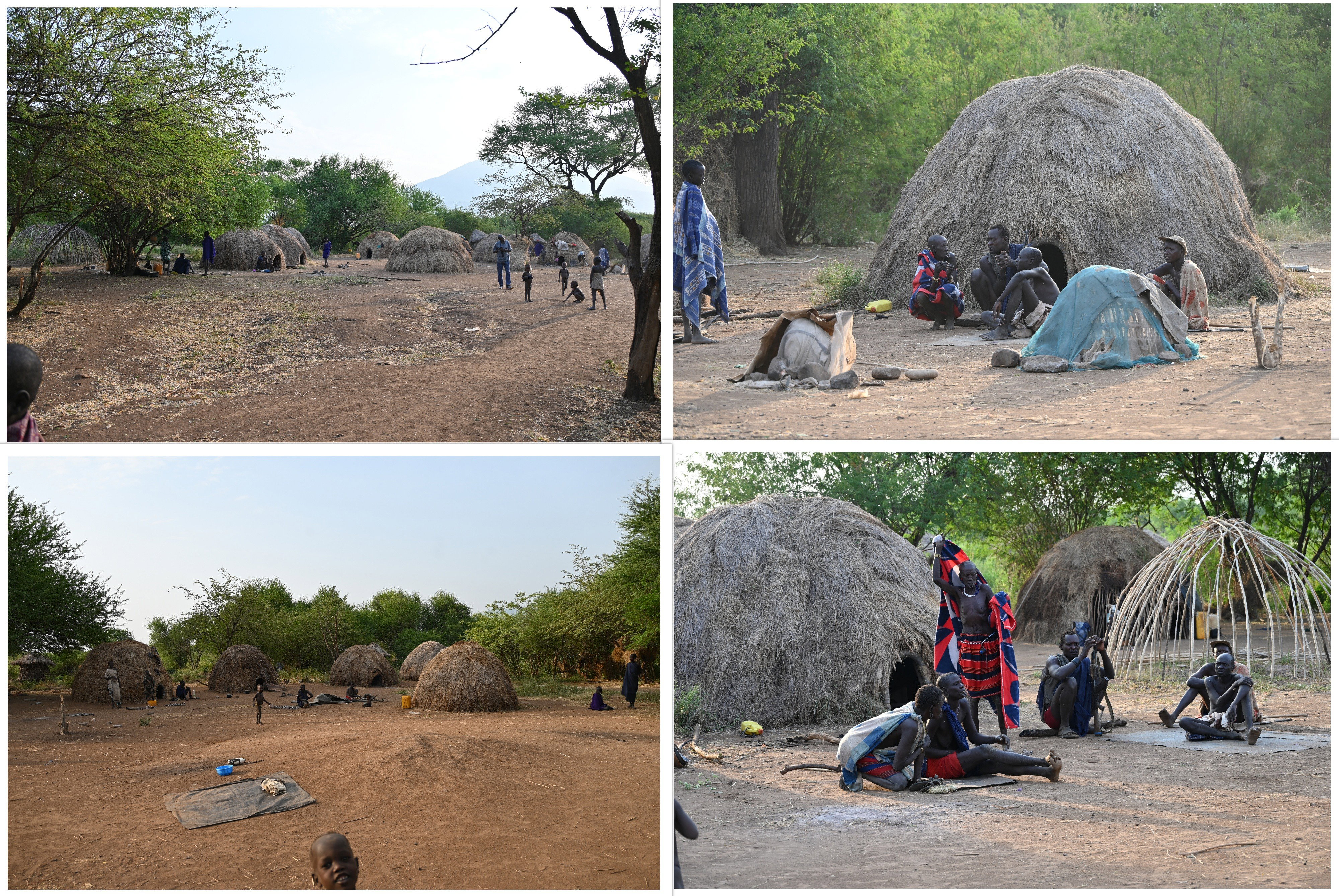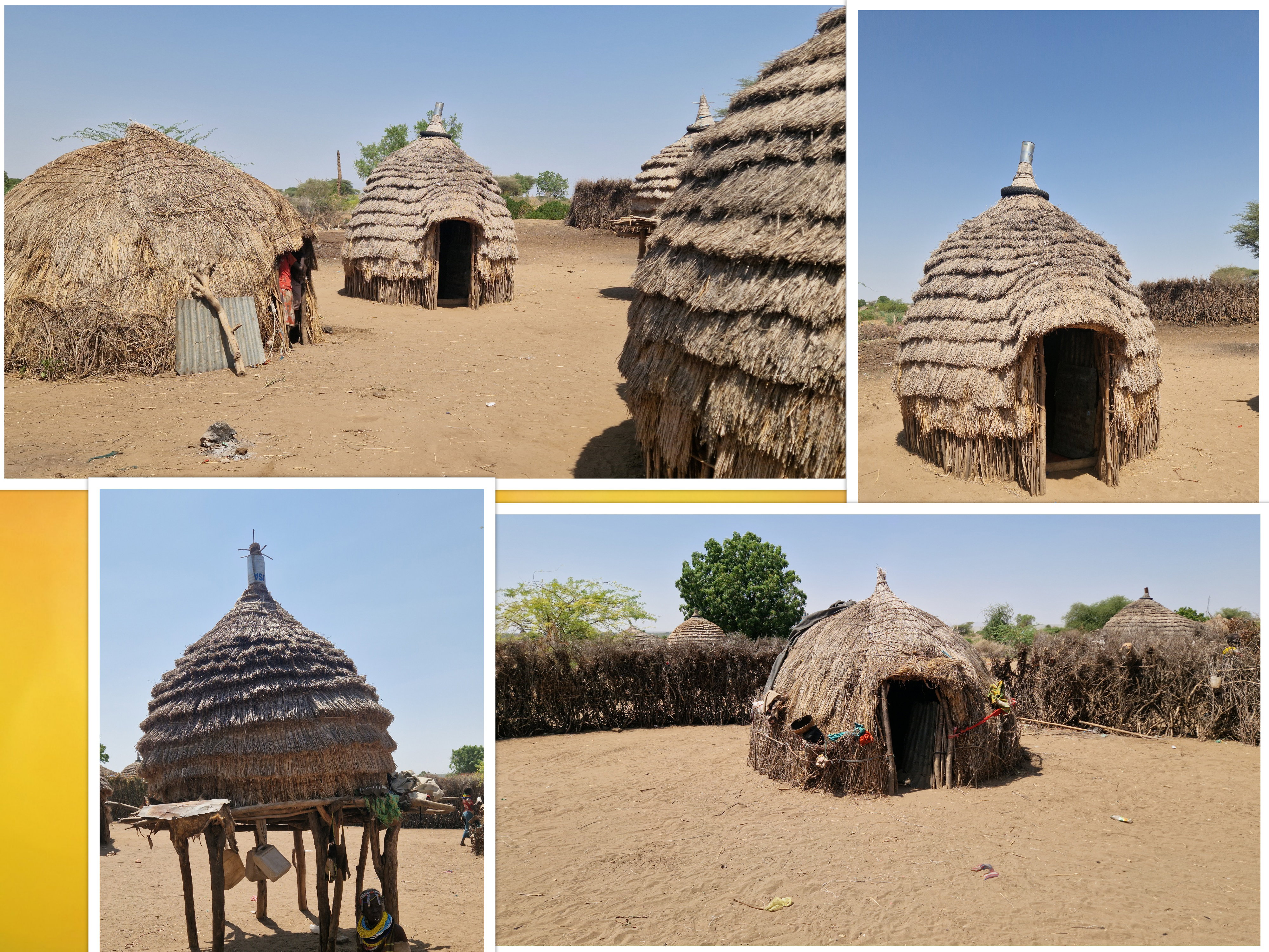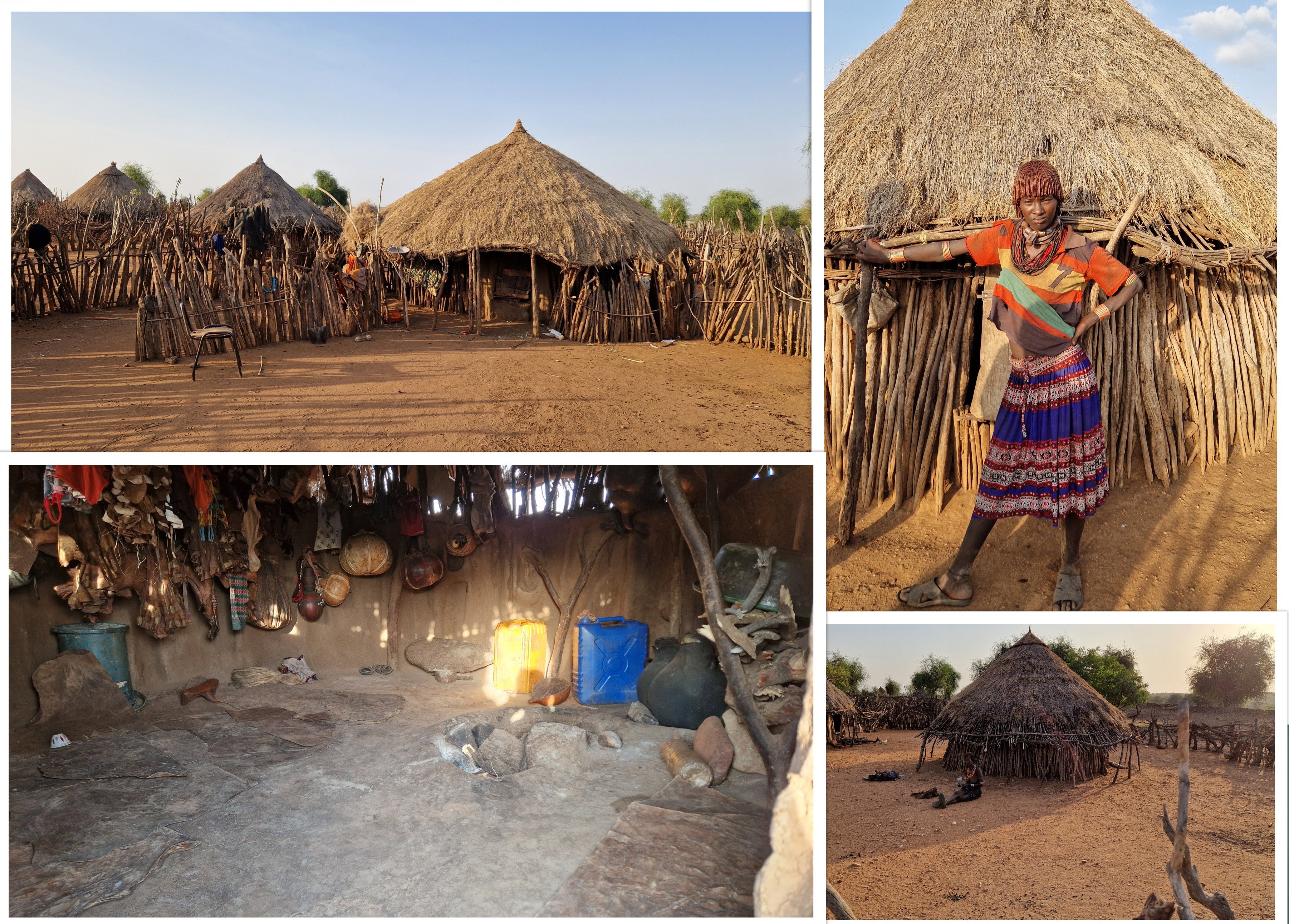 Leurs villages sont composés de petites huttes, faites à partir d'une ossature en branches recouverte de paille. L'entrée des huttes est toute petite, moins d'un mètre de hauteur, interdit aux gros !!!