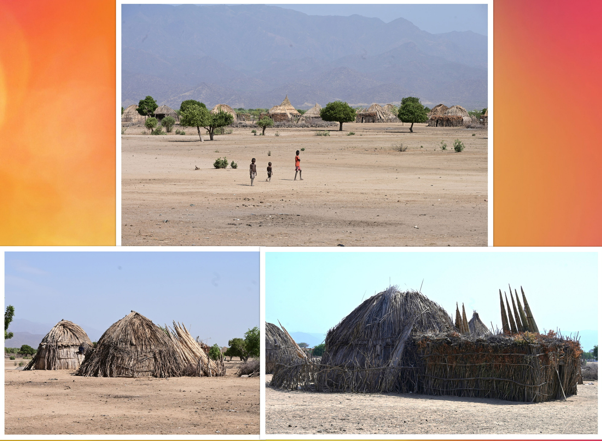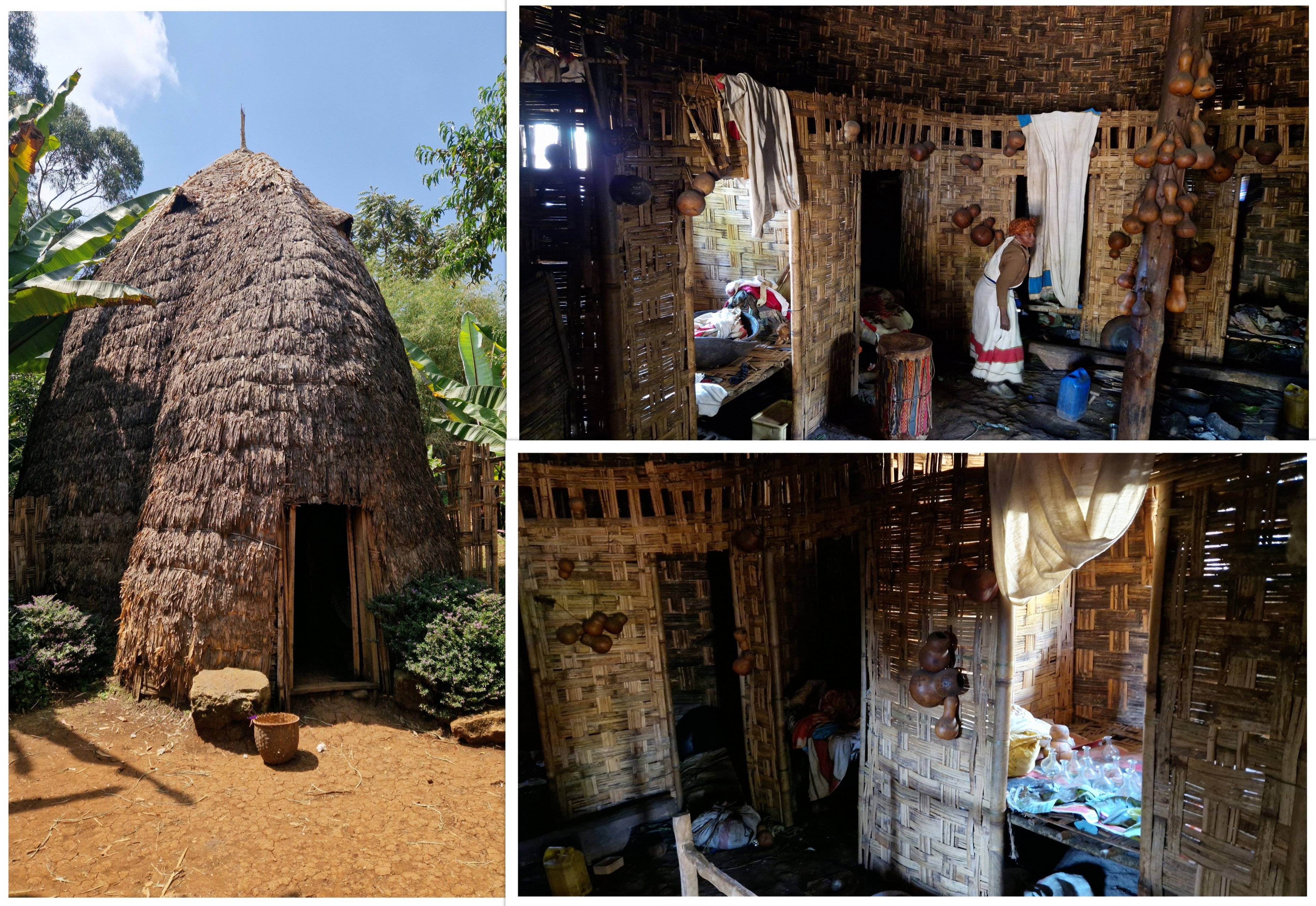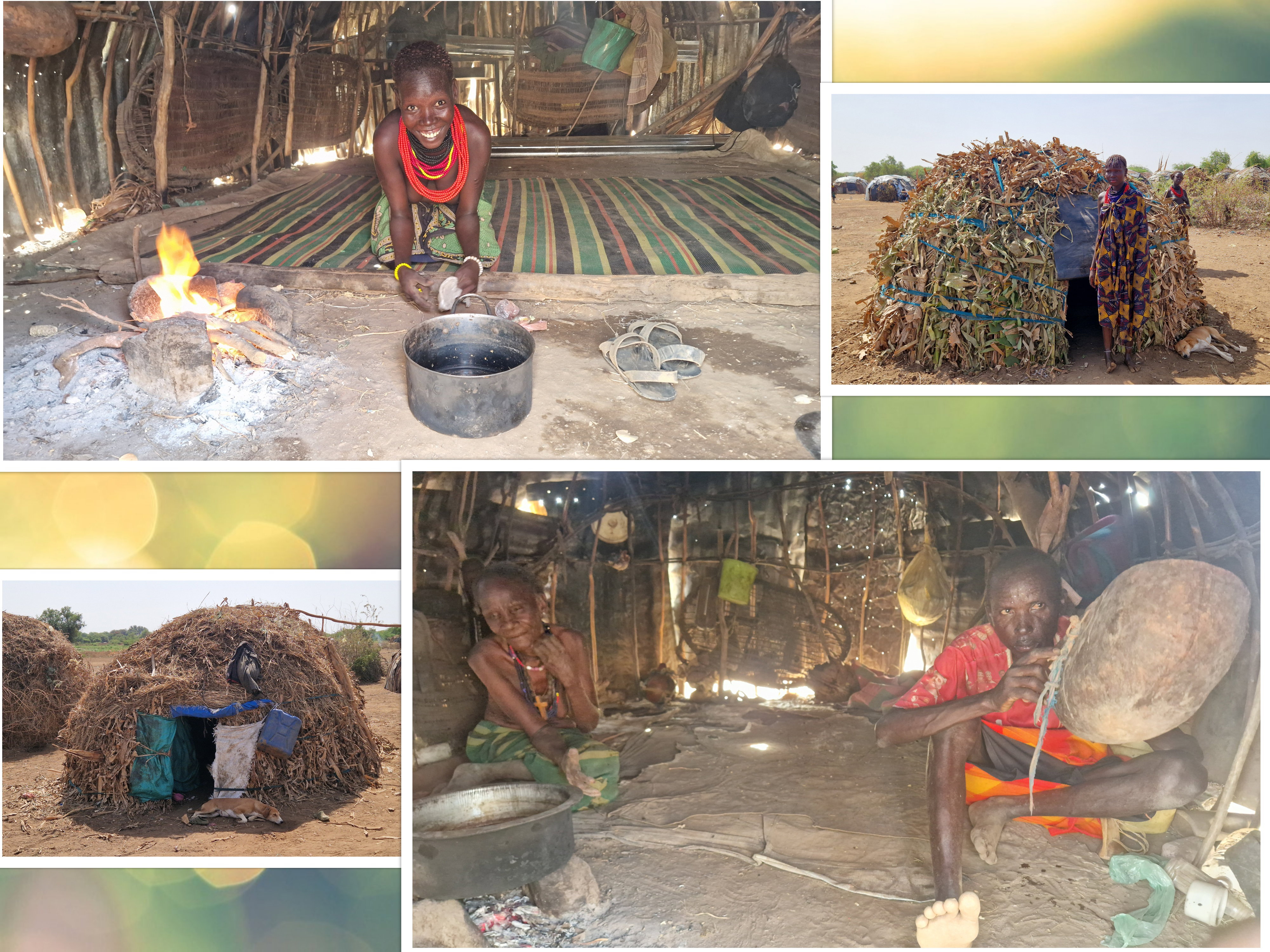 Leurs villages sont composés de petites huttes, faites à partir d'une ossature en branches recouverte de paille. L'entrée des huttes est toute petite, moins d'un mètre de hauteur, interdit aux gros !!!