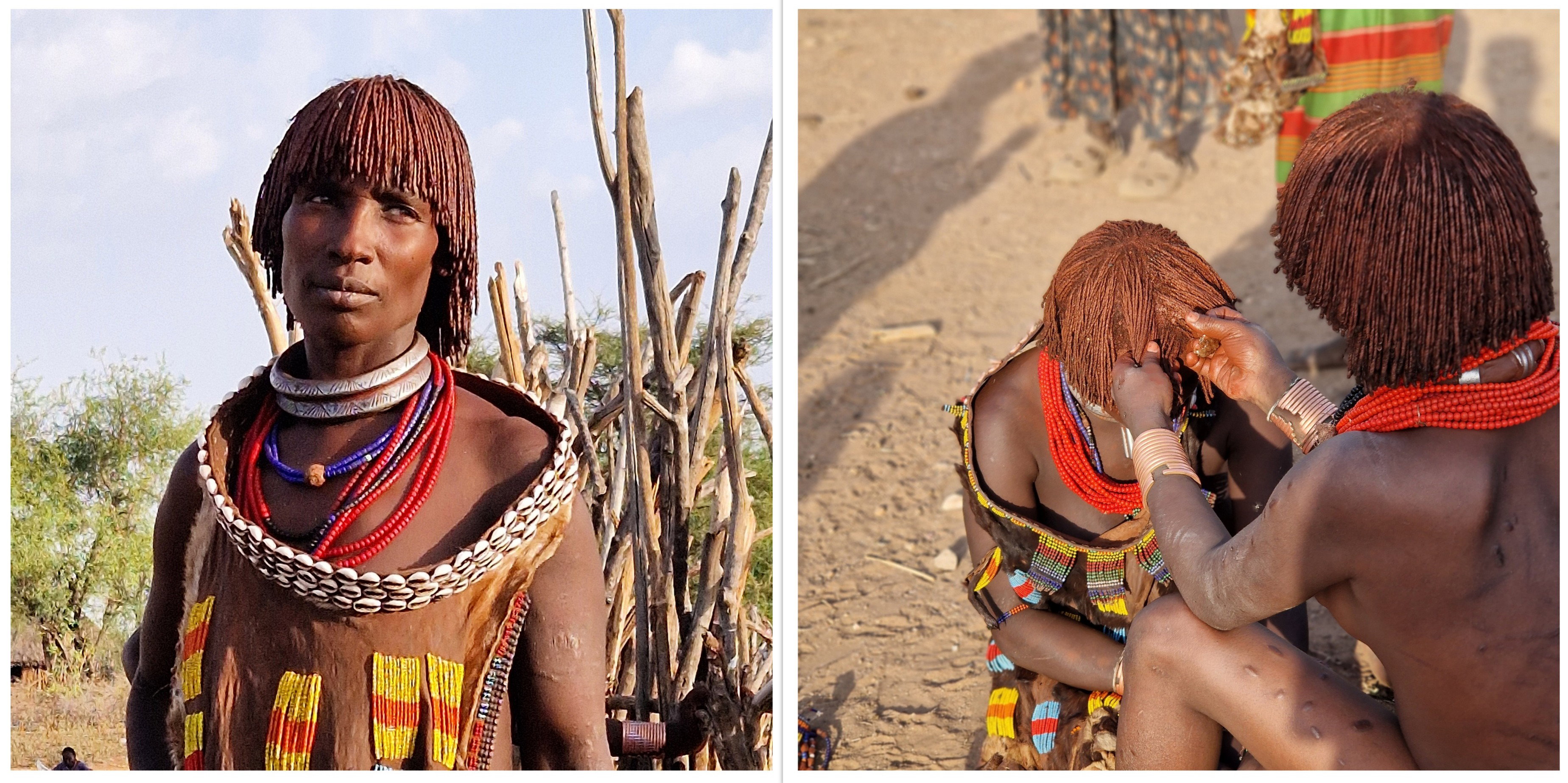 Les femmes Hamer ont des coiffures enduites d'ocre rouge et de beurre, elles portent des colliers de perles, et ont des scarifications décoratives sur le corps.
