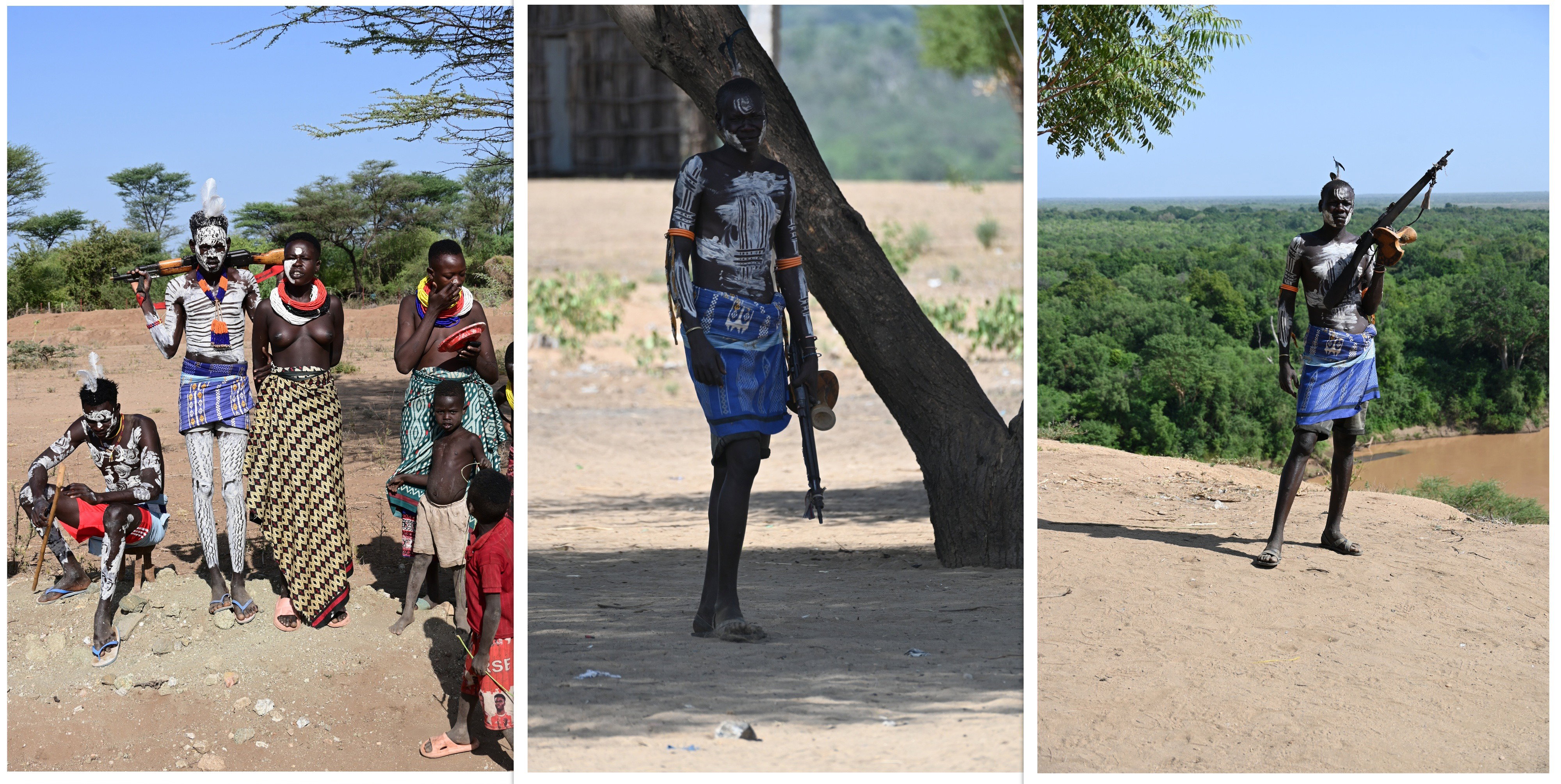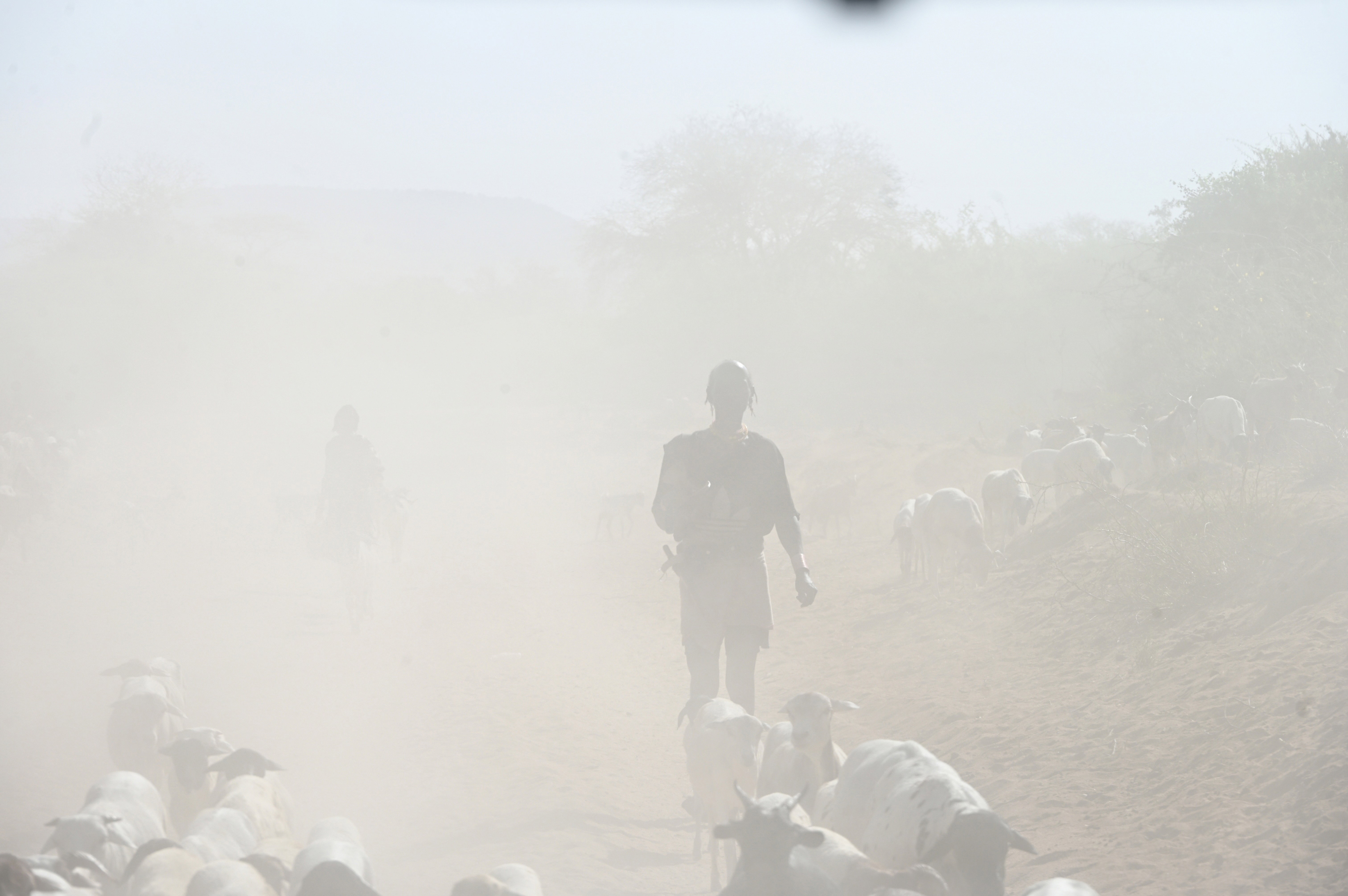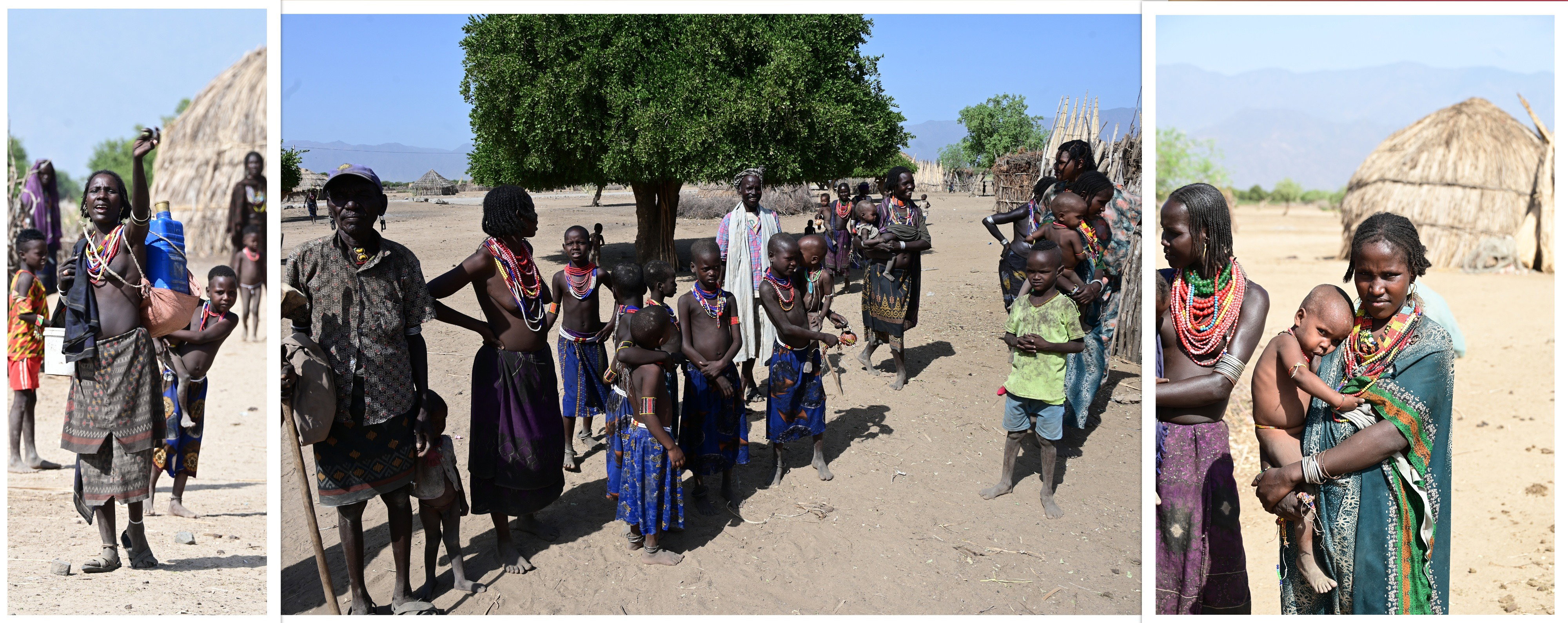 Le village que nous visitons est difficile d'accès, même si nous pouvons y accéder avec notre voiture. A peine garés, les nuées d'enfants nous entourent, au loin, les hommes tous armés d'un fusil. Ils protègent leurs troupeaux contre l'ethnie voisine, les Karos.