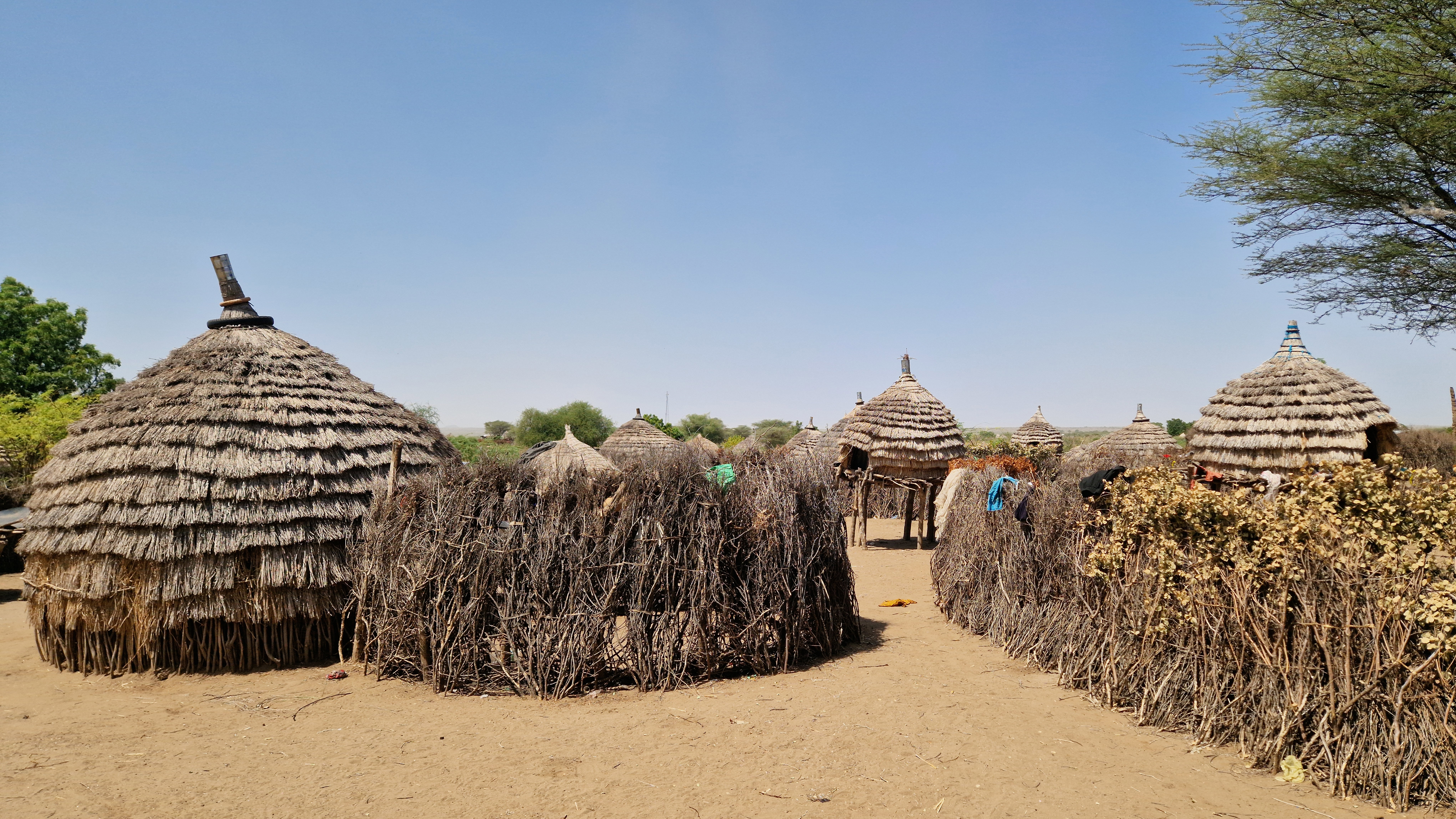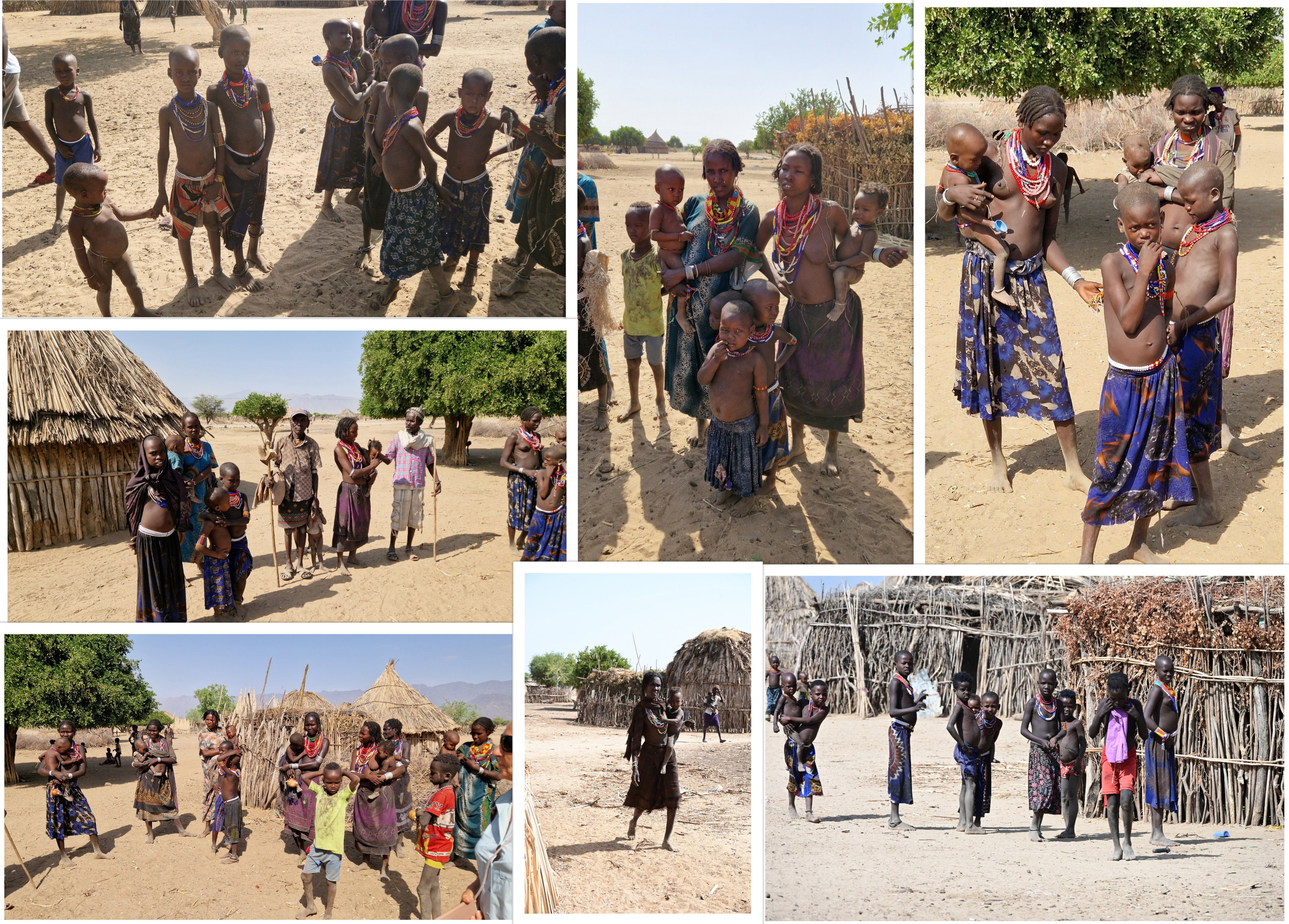Les maisons sont entourées d'une clôture en épineux, et les chèvres sont rentrées dans l'enclos le soir. Chaque femme a sa propre hutte avec les enfants, le tout dans la même espace clôturé si elles sont mariées au même homme. L'homme va d'une hutte à l'autre ... Ici aussi, 6 à 8 enfants par femme !