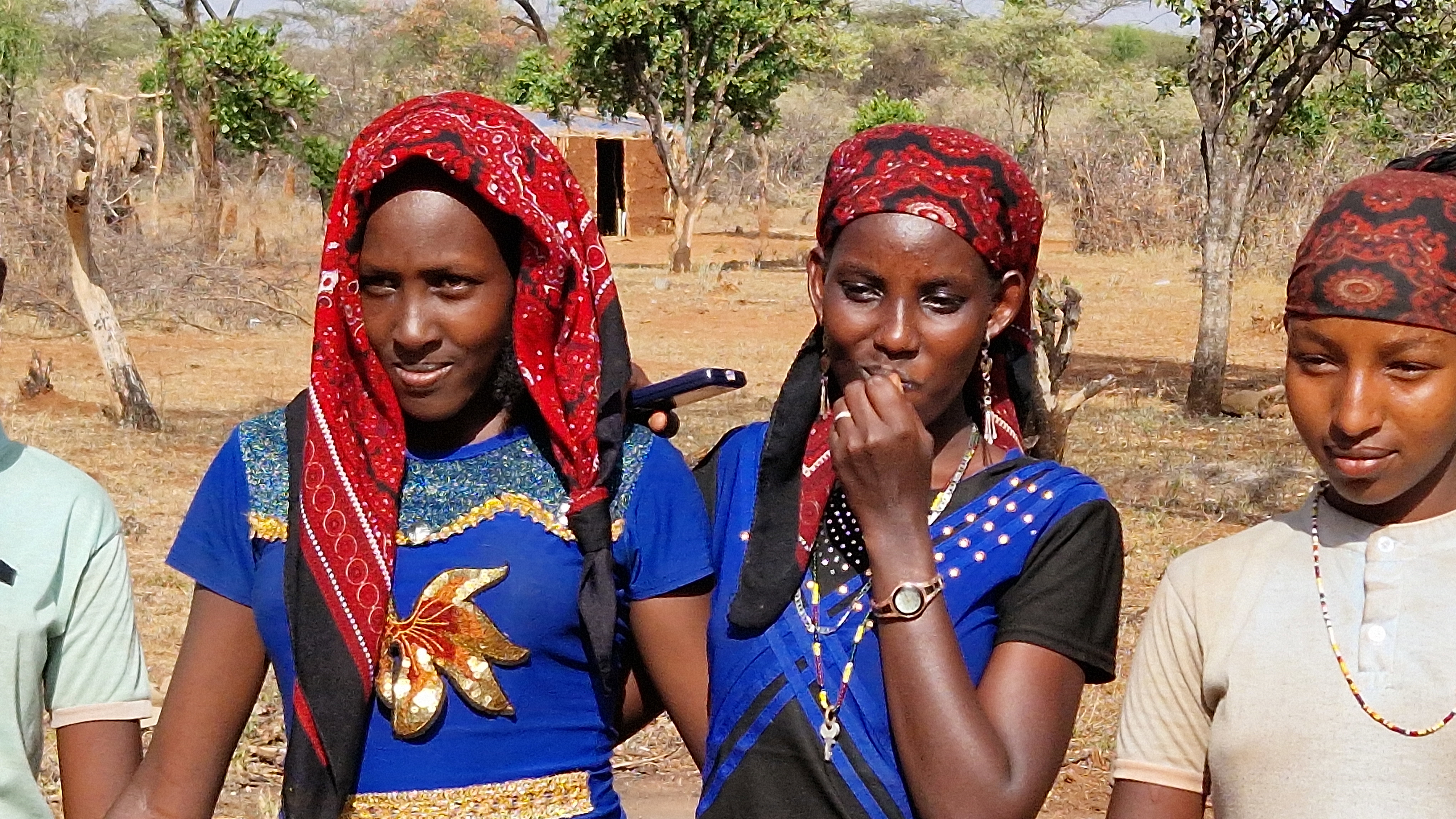 Les femmes sont habillées de couleurs vives avec des colliers.