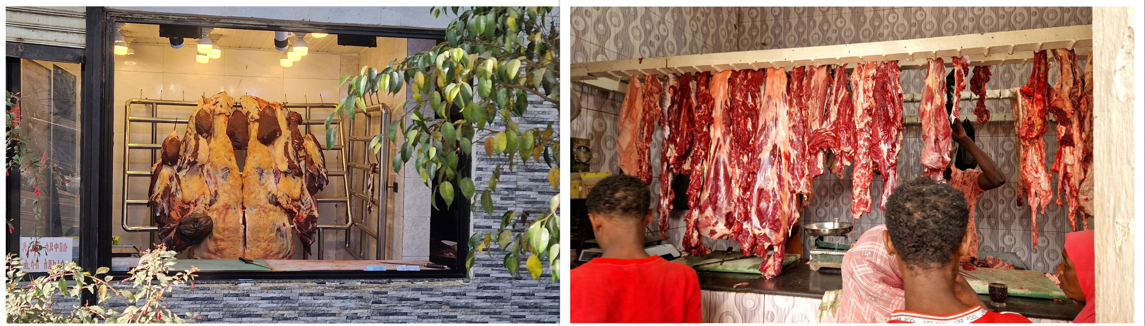 Dans la religion orthodoxe, il y a de nombreux jours de carème, où on ne peut manger que jusqu'à 15 heures, ou ne pas manger de viande du tout (c'est le cas pendant 55 jours avant Pâques). Donc, les éthiopiens se précipitent sur la viande dès que possible ! Les restaurants viande sont tous identiques : une carcasse de boeuf (sans les os) étalée sur des tubes inox (rien de réfrigéré), et le boucher (souvent en tenue) va découper la viande pour la servir. Ils ne font pas de différence entre les morceaux.