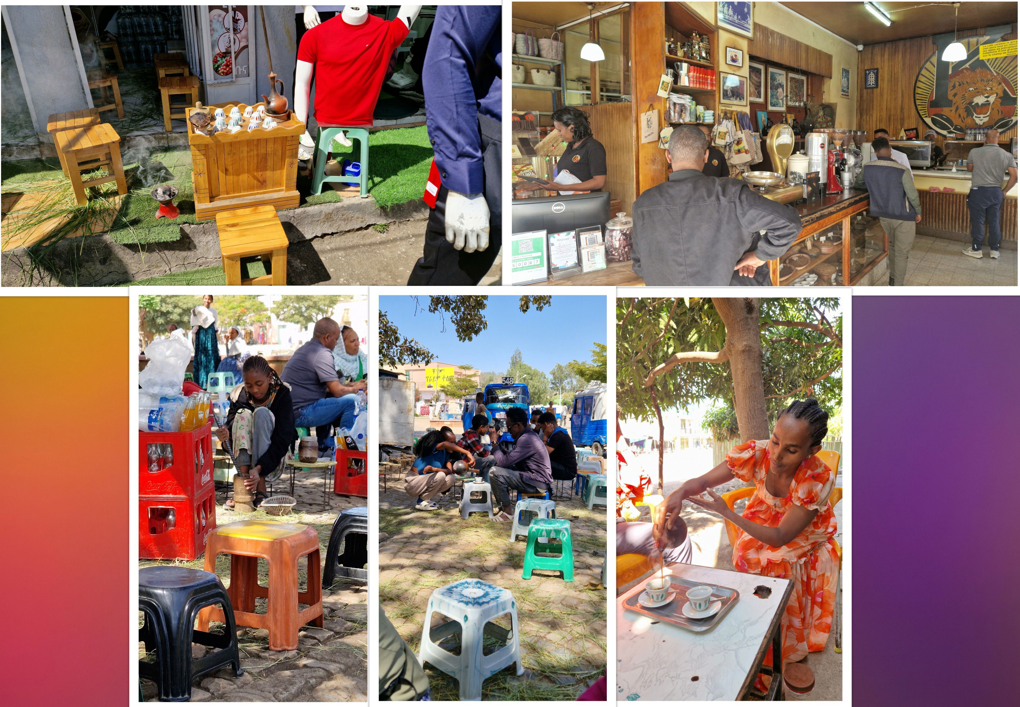 Tant que nous sommes au restaurant, le plus important pour les éthiopiens est de boire du café, mais selon un cérémonial très précis. On trouve des cafés absolument partout, et ce sont vraiment des "cafés" car ils ne servent que du café.