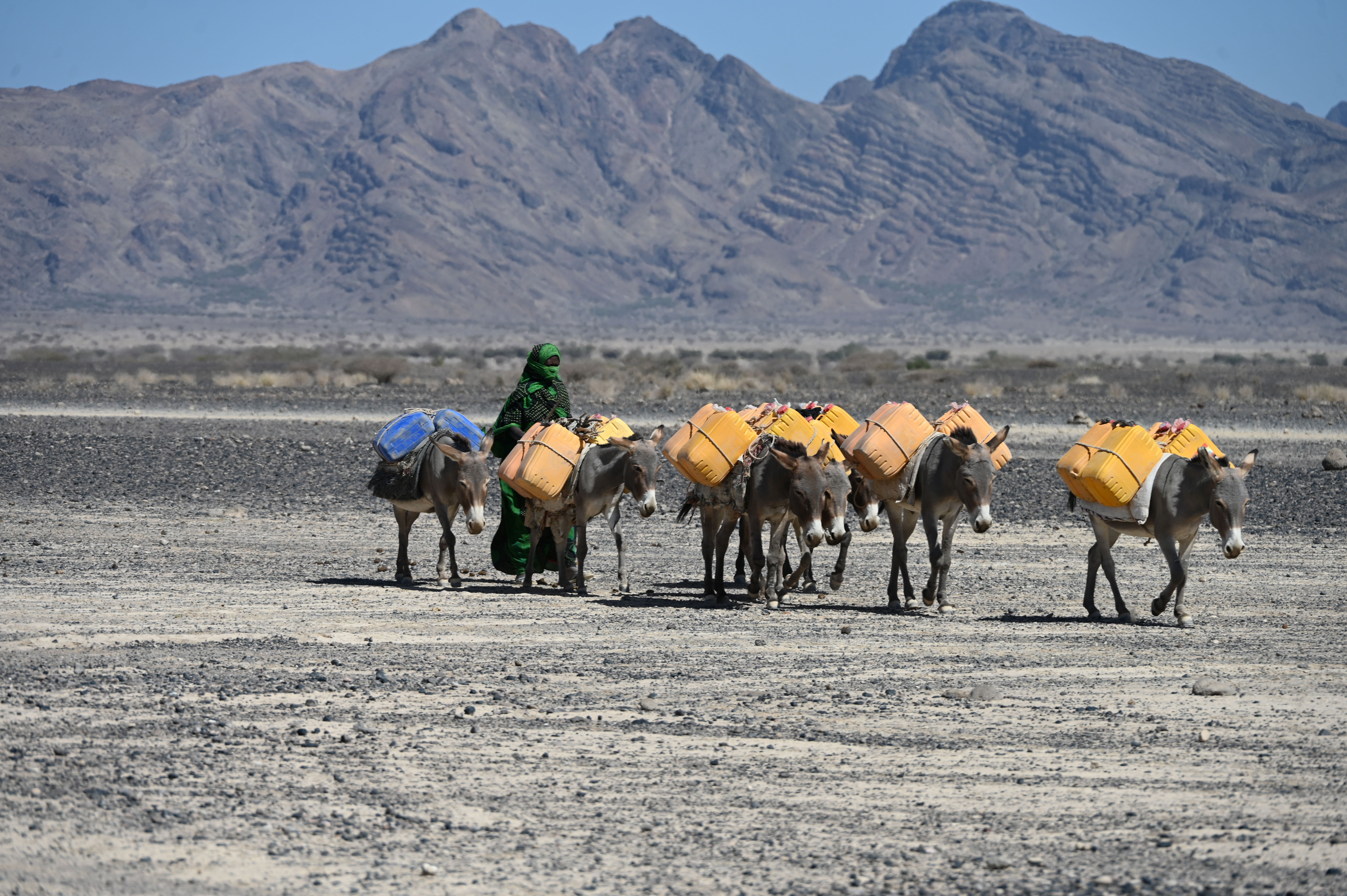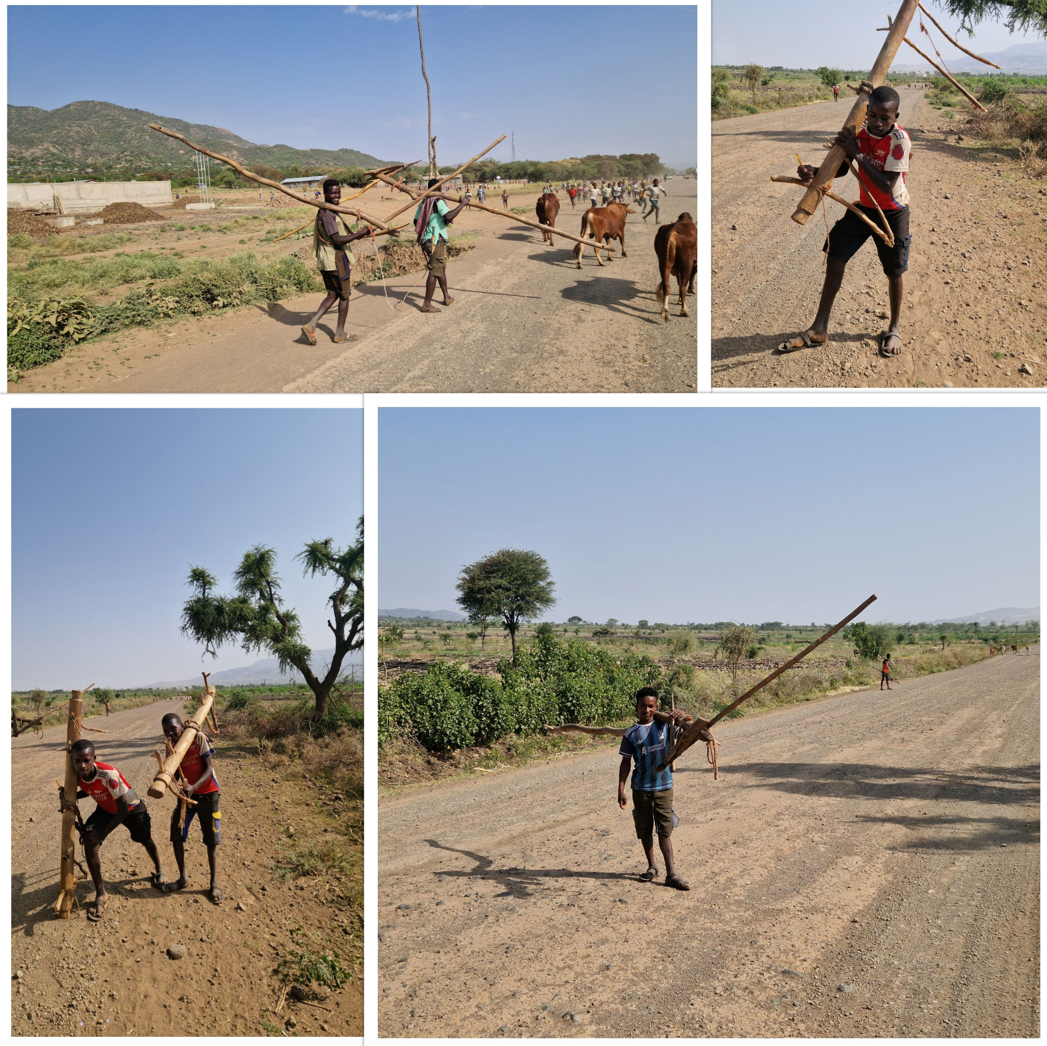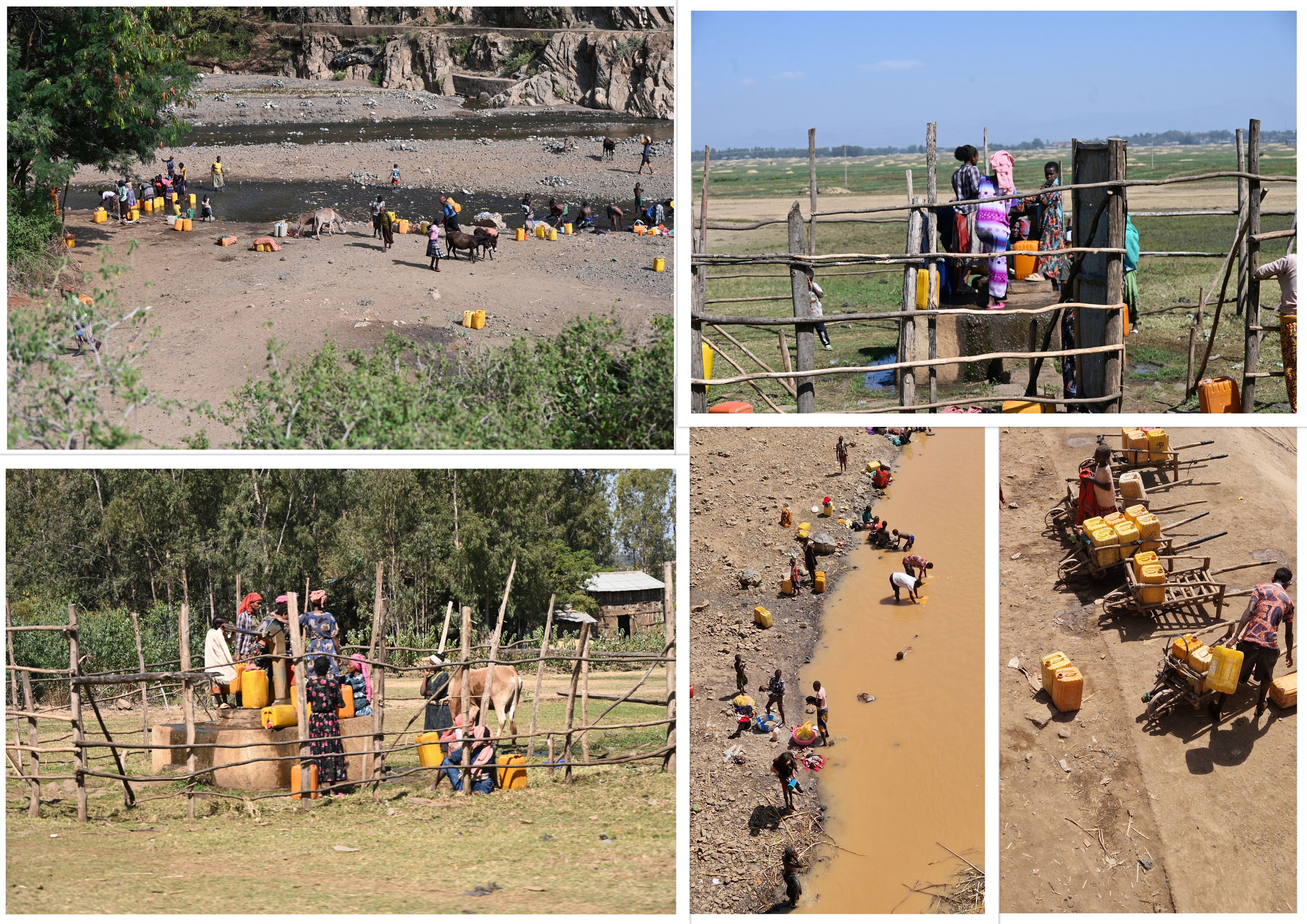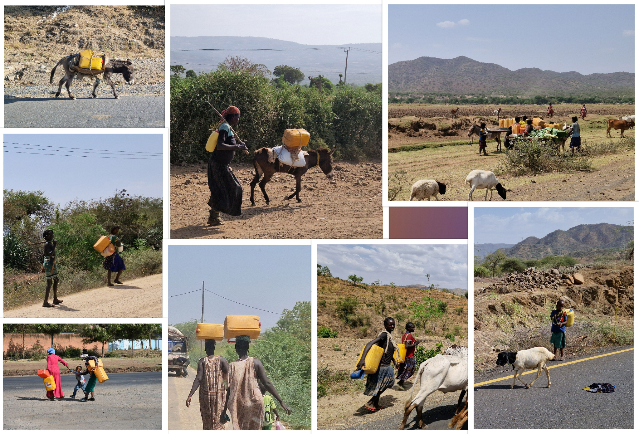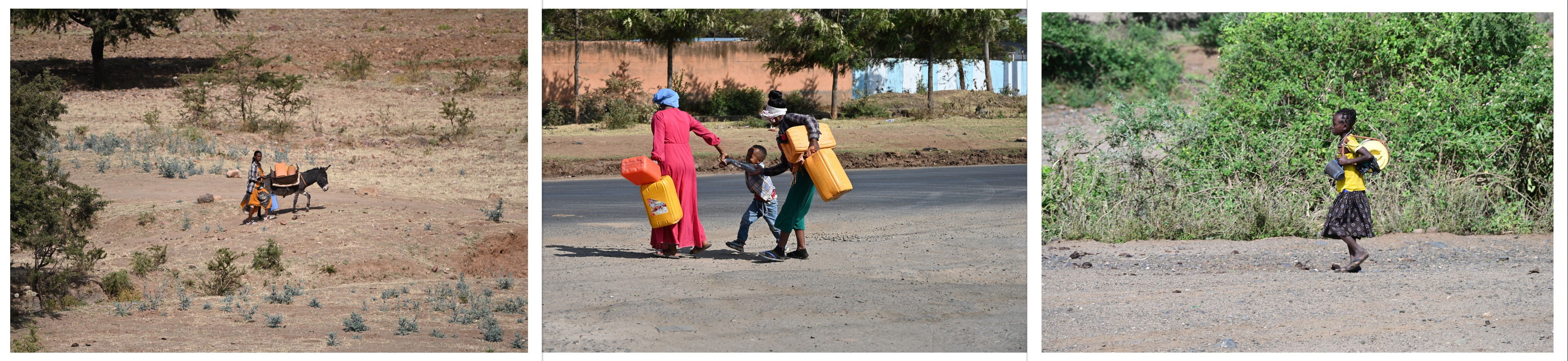 Ce qui est le plus commun en Ethiopie, à la campagne comme dans les grandes villes (sauf Addis-Ababa), ce sont ces images des bidons jaunes qui sont transportés à dos d'âne ou dos de femmes. L'eau courante n'existe pas ! L'électricité arrive parcimonieusement jusqu'à certaines maisons, le téléphone fonctionne partout grâce aux antennes relais plantées partout, mais l'eau doit être récupérée à un endroit pour être amenée à la maison.